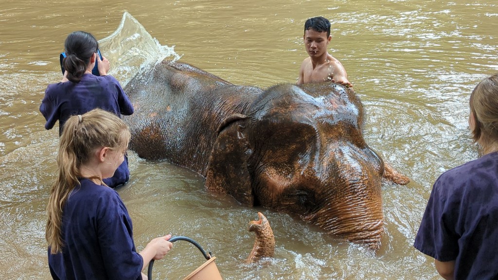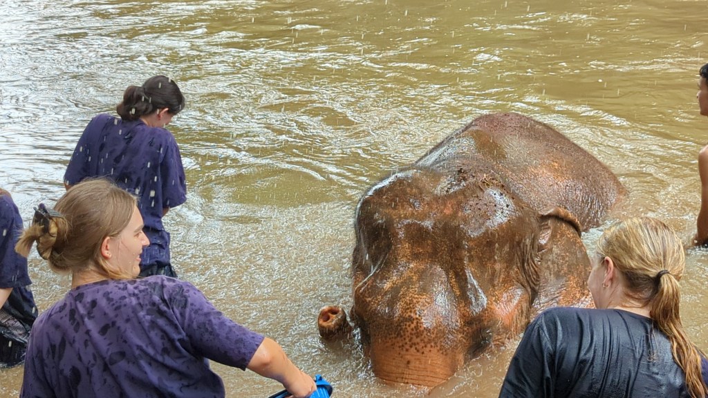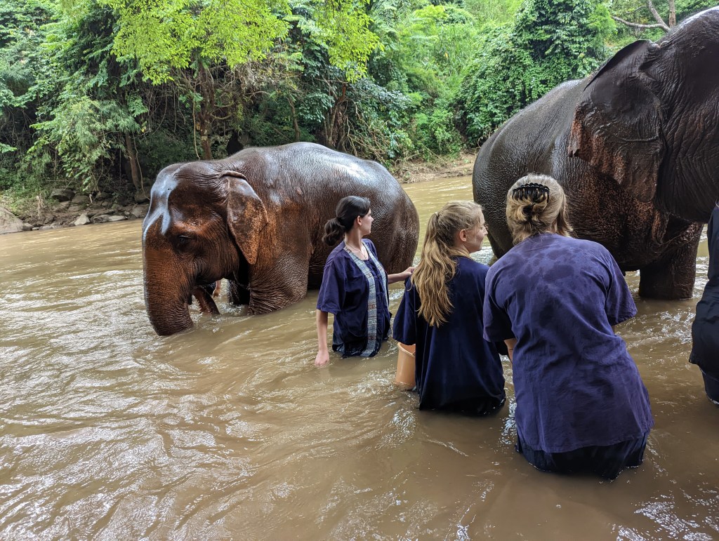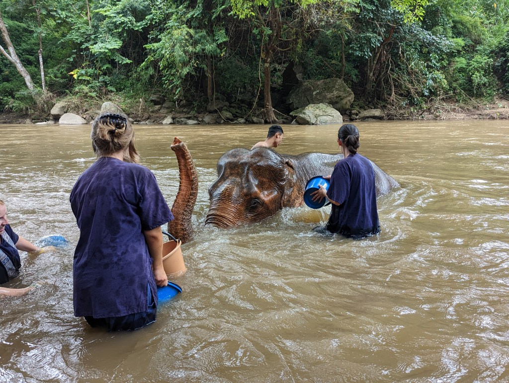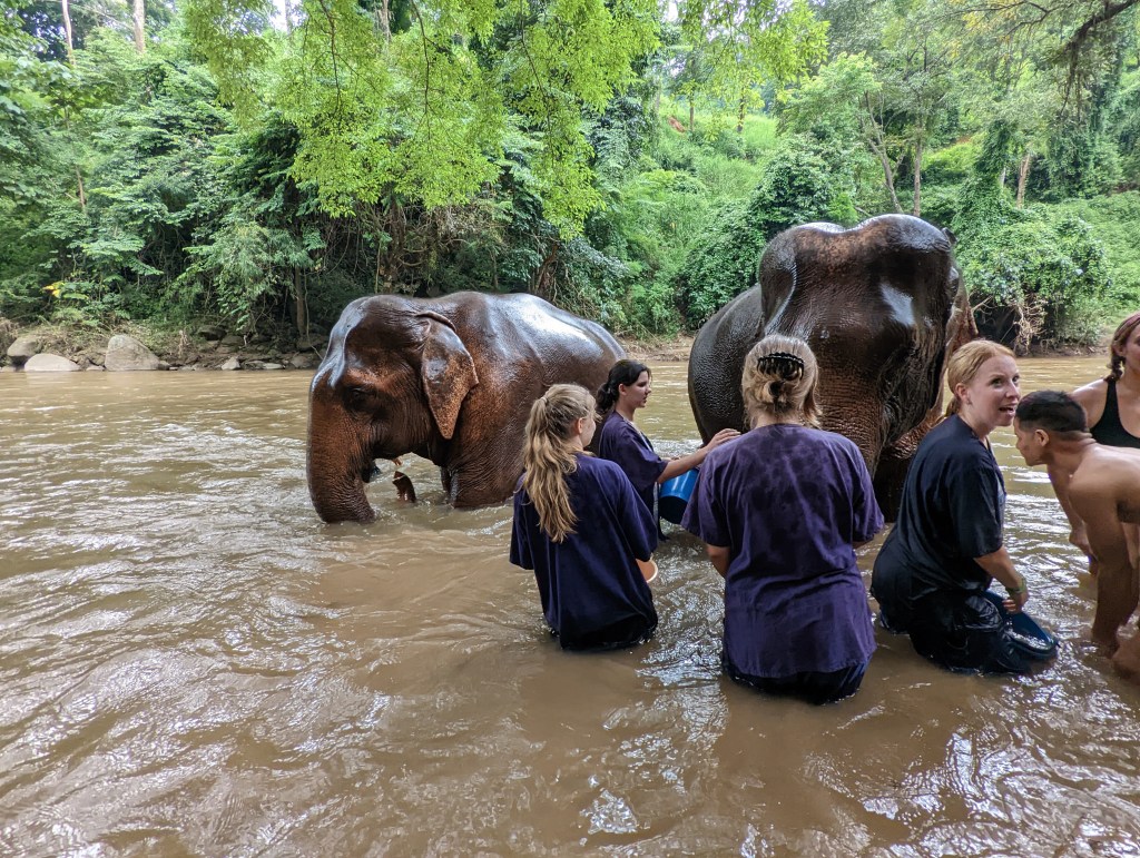 To cap off our day with Tamon and Sriprai, we all got to cool off in the river and help bathe them. The sanctuary provided us with clothes to wear, however I’d definitely recommend wearing a bathing suit underneath or bringing a change of undergarments—you don’t want to be soaked for the 40-mile ride back.