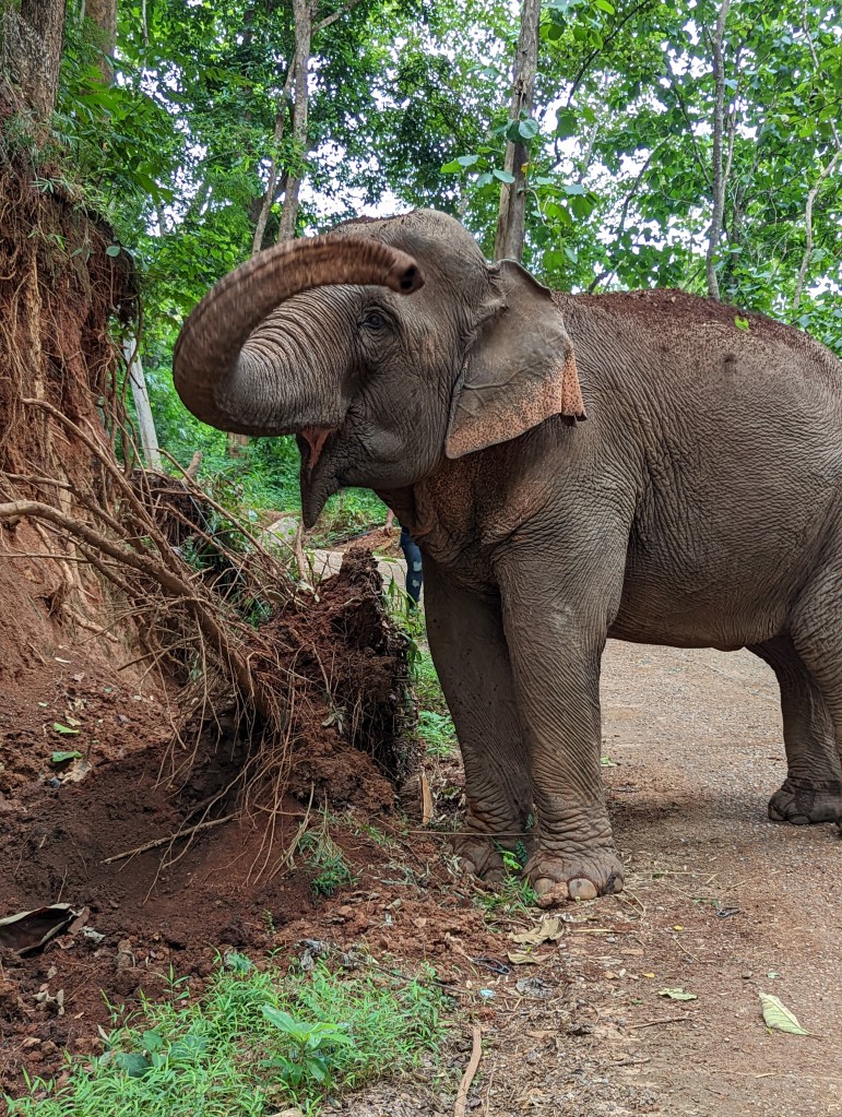 Once all of the rice balls were consumed, we started walking through the forest again. Amid their frequent stops for leafy snacks, the elephants would often scoop up dirt with their trunks and throw it onto their heads/backs. They do this to keep bugs away and to keep cool in the humid Thailand heat.