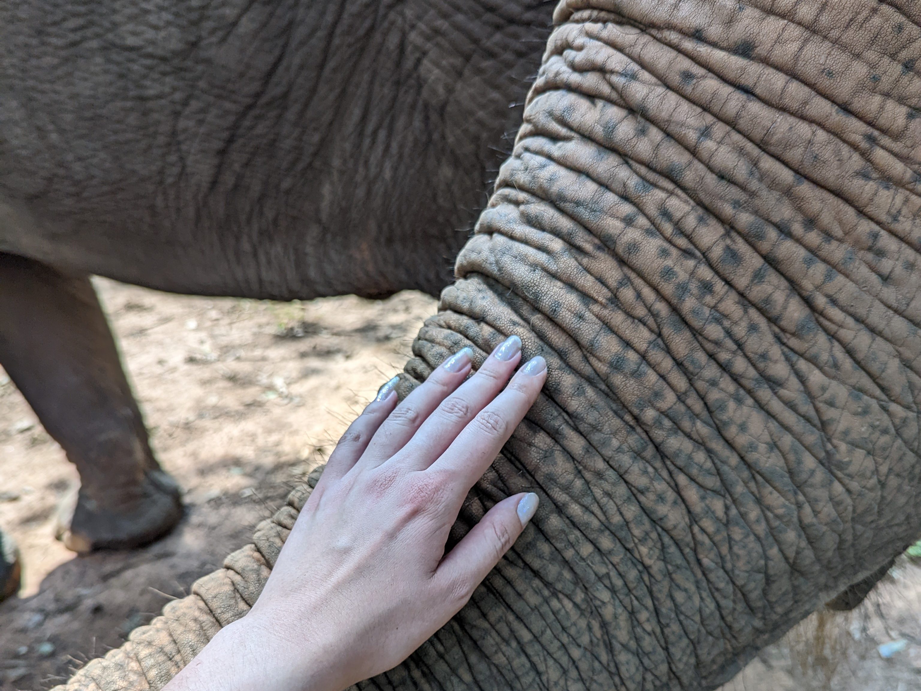 The elephants took the bananas directly from our hands with their trunks and put the fruit in their mouths themselves. It was incredible to observe how nimble they were, utilizing their trunks like we use hands. They also allowed us to touch their trunks, which were a completely different texture than I had imagined. I thought they would feel really leathery, but I forgot elephants have hair, so they were actually quite rough and prickly.