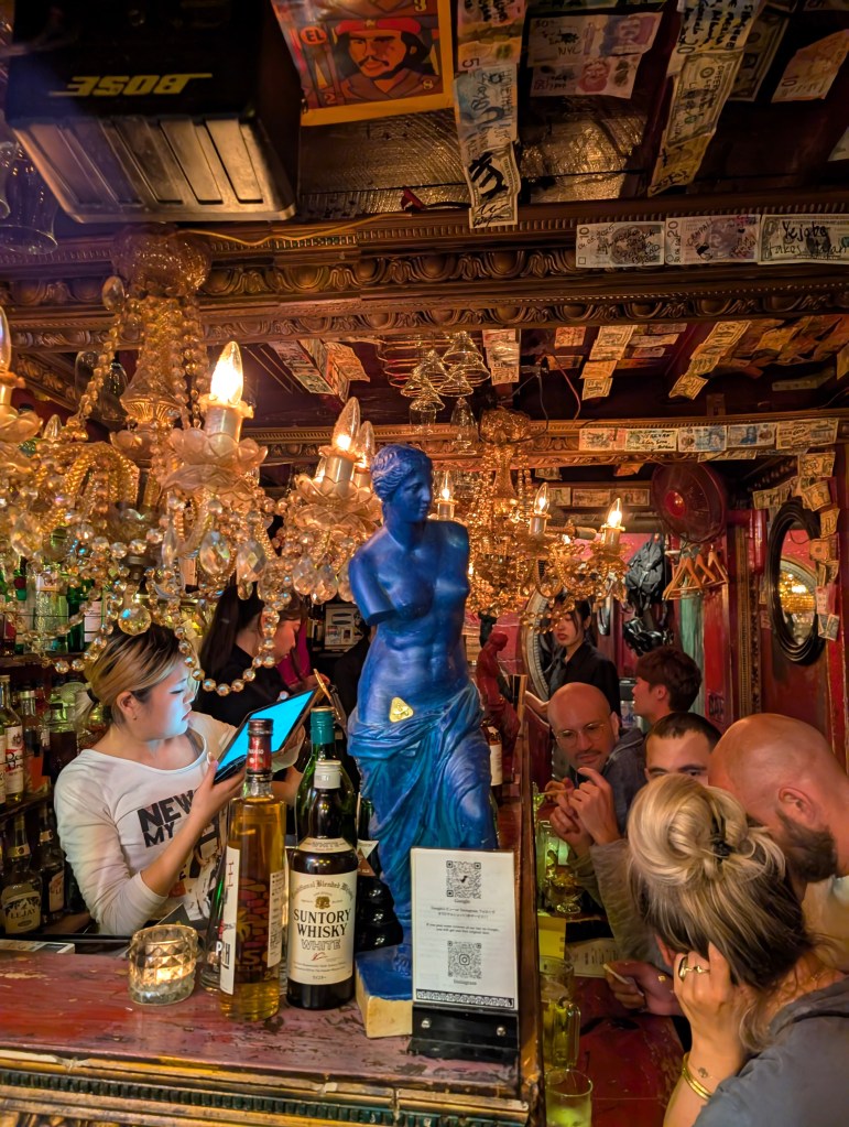 The space was compact with maximalist décor: two bejeweled chandeliers and a disco ball dangled over the bar, and dozens of foreign paper currencies were taped to the low ceiling. All the walls were painted a bright red—all except the wall of alcohol behind the counter—and at the entrance sat a blue miniature of an ancient Greek Venus de Milo sculpture. The 7-person bar was full, so we had to shimmy behind the other guests to climb up a narrow, winding staircase that eventually gave way to the open-air rooftop.